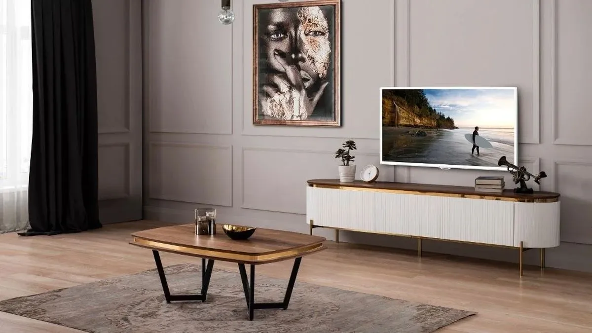 TV ünitesi, sehpa, kitaplık, halı